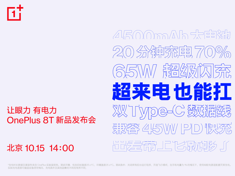 9月25日,一加手机宣布即将发布的一加8T将搭载65W超级闪充,配合4500mAh大电池,仅需20分钟就能充电70%,充电快、续航久。一加8T标配全新的双Type-C口数据线,它不仅支持65W超级闪充,还兼容45W的PD快充。出门在外,只用带一套充电器就能为一加8T、电脑、平板等多种设备迅速补充电量。