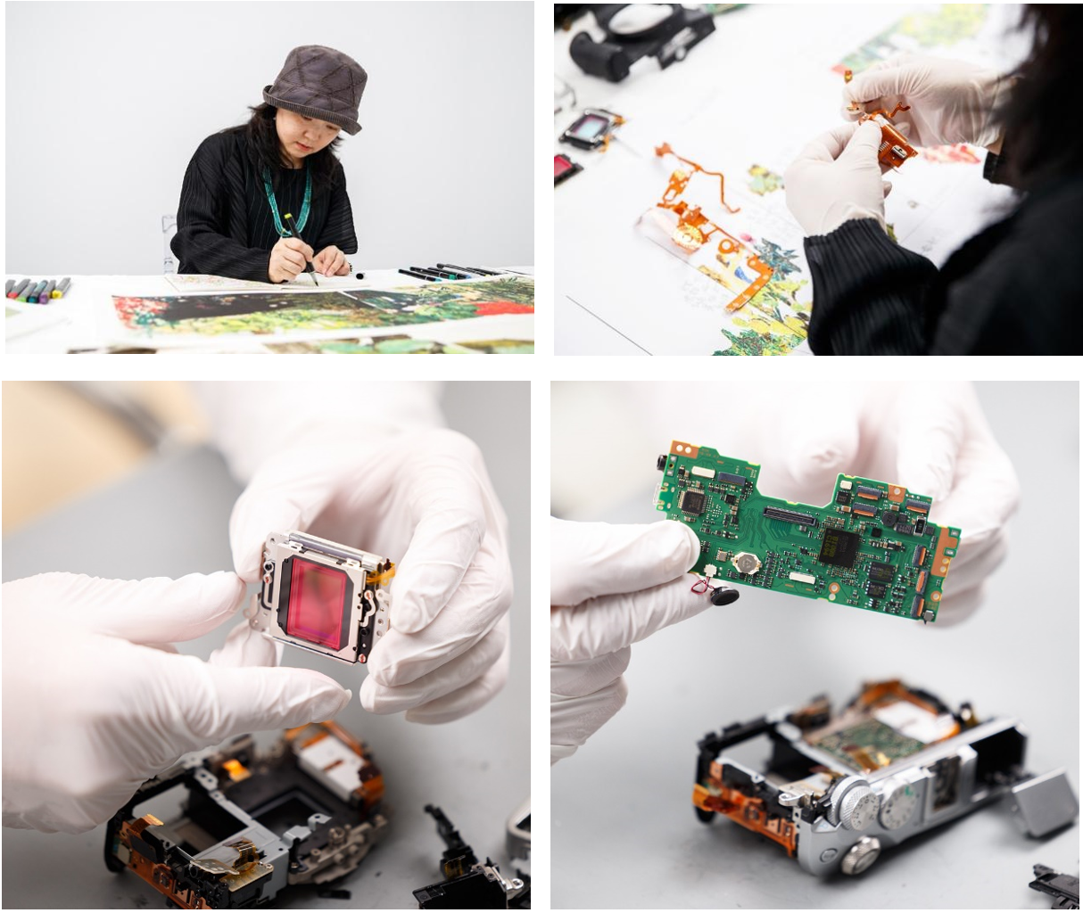 在创作过程中,康蕾老师表示:“我的第一台相机就是佳能相机,以往都是用相机去拍摄和记录外部的世界,这是第一次有机会近距离的了解相机的内部结构,有了全新的认识角度,发现整个佳能相机本身就是一件艺术品,里边的各种金属机械零件和反光折射的镜片特别的精致精美,材料质感不同,颜色和形状也都不一样,带来很多创作灵感 。 ”