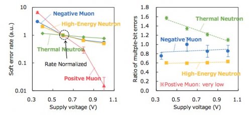 发现μ子和中子在错误率的电源电压依赖性、多位错误的比率以及多位错误模式的特征方面存在明显差异。该结果为全球首次发现。