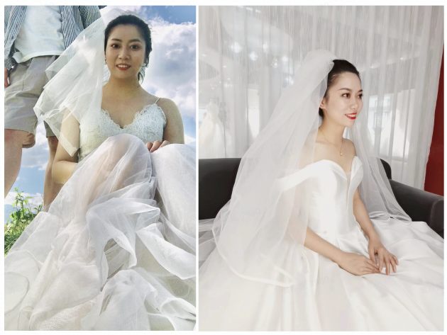 图说:大林拿出自己2019年10月拍婚纱照的照片(左),又对比着2020年7月婚礼当天的照片(右),整个肩颈的线条都得到了优化,躯体看起来更纤薄、轻盈了