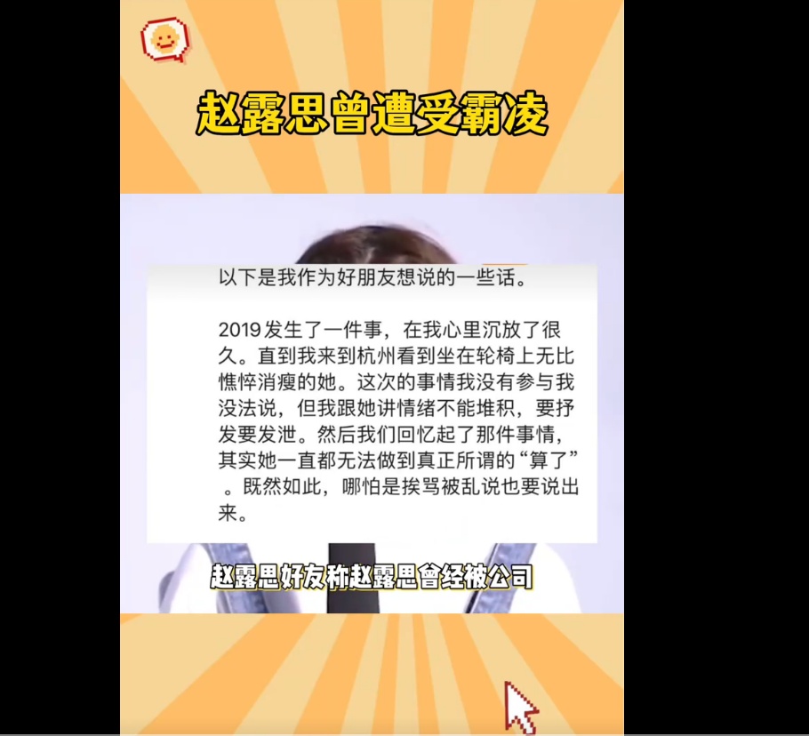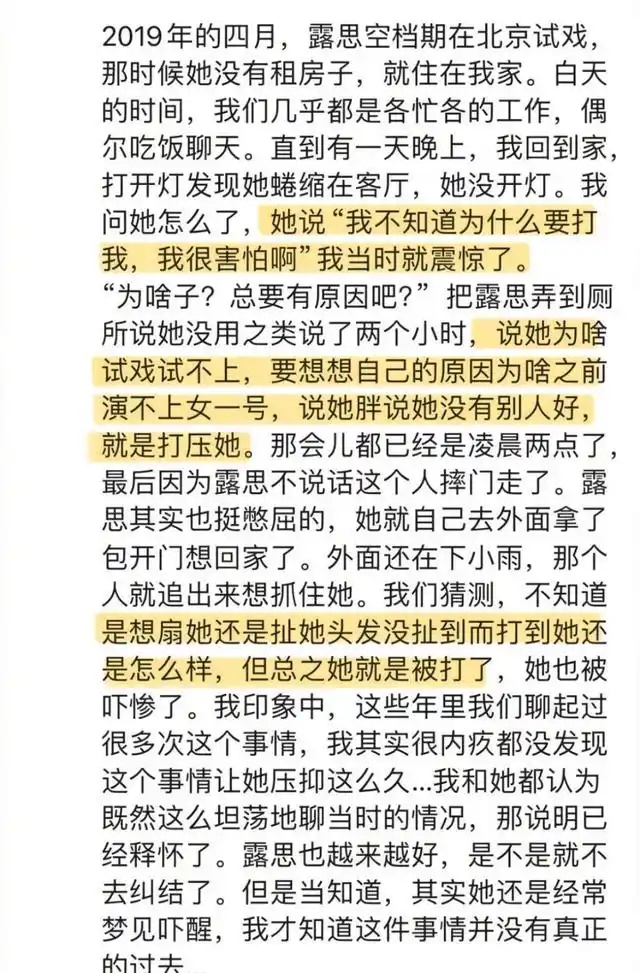 曝出的信息显示,2019年4月的一个深夜,赵露思在北京参与试戏时,被公司老板突然叫醒并遭到严厉责备。原因仅仅是她未能通过试镜测试,老板还指责她体型过胖,无法胜任角色。在长达两小时的辱骂中,赵露思被带到厕所内进行“说教”,期间遭受了身体上的攻击,包括扇巴掌和扯头发等行为。事后,老板以“喝多了”为借口轻描淡写地道歉,并向赵露思的母亲抱怨她不听话。由于当时合约未到期,赵露思选择隐忍,没有公开此事。然而,这段经历对她造成了巨大的心理阴影。她曾向好友倾诉,但因担心证据不足而未报警。赵露思的好友近日发文曝光了这段往事,呼吁公众关注她的健康状况,并希望公司能够给予解释和赔偿。